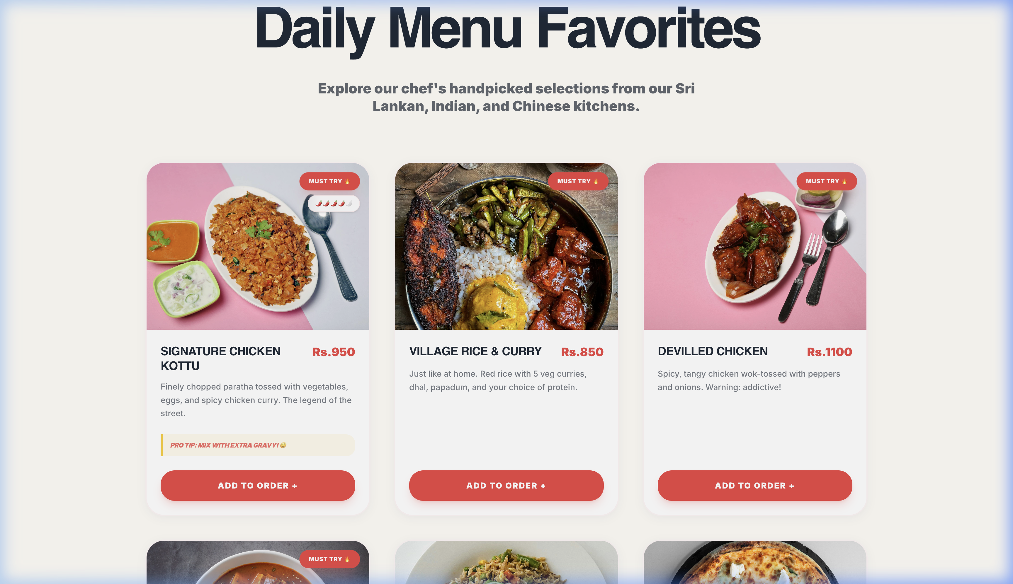 A high-performance food delivery platform designed for local street food favorites, featuring a WhatsApp-integrated ordering system and a premium menu interface.